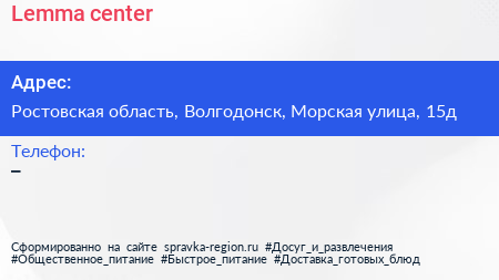 Lemma center по адресу Ростовская область, Волгодонск, Морская улица, 15д в дальнейшем Организация, размещена в следующих категориях: