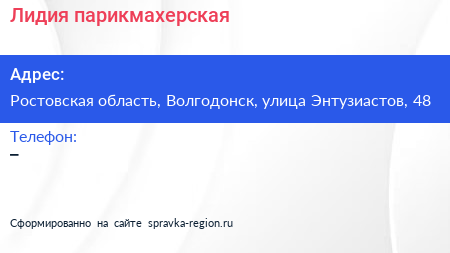 Лидия, парикмахерская по адресу Ростовская область, Волгодонск, улица Энтузиастов, 48 в дальнейшем Организация, размещена в следующих категориях: