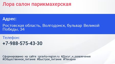 Лора, салон-парикмахерская по адресу Ростовская область, Волгодонск, бульвар Великой Победы, 34 в дальнейшем Организация, размещена в следующих категориях: