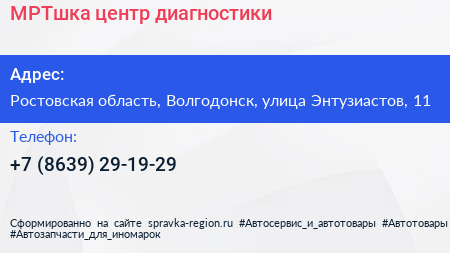 МРТшка, центр диагностики по адресу Ростовская область, Волгодонск, улица Энтузиастов, 11 в дальнейшем Организация, размещена в следующих категориях: