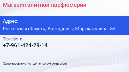 Магазин элитной парфюмерии по адресу Ростовская область, Волгодонск, Морская улица, 86 в дальнейшем Организация, размещена в следующих категориях: