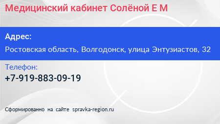 Медицинский кабинет Солёной Е.М. по адресу Ростовская область, Волгодонск, улица Энтузиастов, 32 в дальнейшем Организация, размещена в следующих категориях: