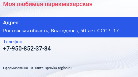 Моя любимая парикмахерская по адресу Ростовская область, Волгодонск, 50 лет СССР, 17 в дальнейшем Организация, размещена в следующих категориях: