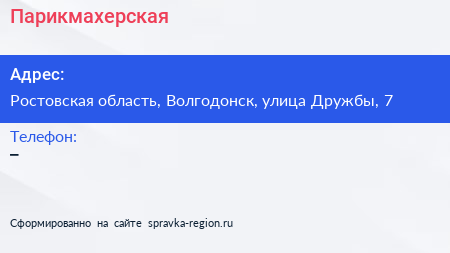 Парикмахерская по адресу Ростовская область, Волгодонск, улица Дружбы, 7 в дальнейшем Организация, размещена в следующих категориях: