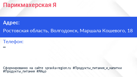 Парикмахерская.Я по адресу Ростовская область, Волгодонск, Маршала Кошевого, 18 в дальнейшем Организация, размещена в следующих категориях: