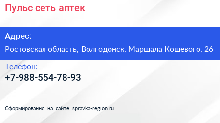 Пульс, сеть аптек по адресу Ростовская область, Волгодонск, Маршала Кошевого, 26 в дальнейшем Организация, размещена в следующих категориях: