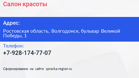 Салон красоты по адресу Ростовская область, Волгодонск, бульвар Великой Победы, 1 в дальнейшем Организация, размещена в следующих категориях: