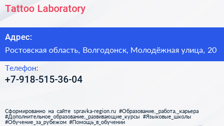 Tattoo Laboratory по адресу Ростовская область, Волгодонск, Молодёжная улица, 20 в дальнейшем Организация, размещена в следующих категориях: