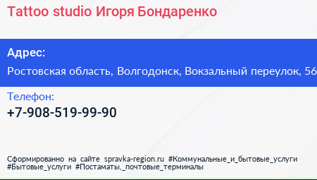 Tattoo studio Игоря Бондаренко по адресу Ростовская область, Волгодонск, Вокзальный переулок, 56 в дальнейшем Организация, размещена в следующих категориях: