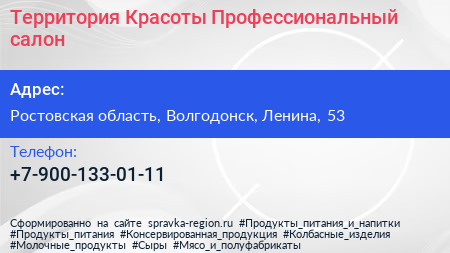 Территория Красоты, Профессиональный салон по адресу Ростовская область, Волгодонск, Ленина, 53 в дальнейшем Организация, размещена в следующих категориях: