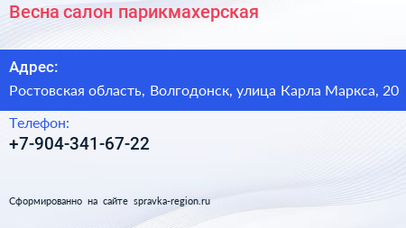 Весна, салон-парикмахерская по адресу Ростовская область, Волгодонск, улица Карла Маркса, 20 в дальнейшем Организация, размещена в следующих категориях: