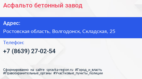 Асфальто-бетонный завод по адресу Ростовская область, Волгодонск, Складская, 25 в дальнейшем Организация, размещена в следующих категориях: