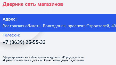 Дверник, сеть магазинов по адресу Ростовская область, Волгодонск, проспект Строителей, 43 в дальнейшем Организация, размещена в следующих категориях:
