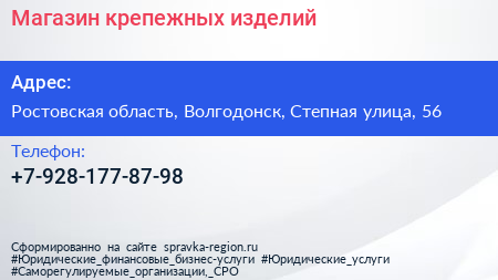 Магазин крепежных изделий по адресу Ростовская область, Волгодонск, Степная улица, 56 в дальнейшем Организация, размещена в следующих категориях: