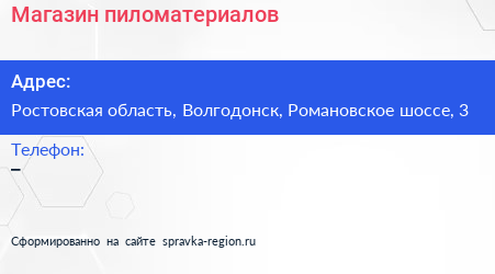 Магазин пиломатериалов по адресу Ростовская область, Волгодонск, Романовское шоссе, 3 в дальнейшем Организация, размещена в следующих категориях:
