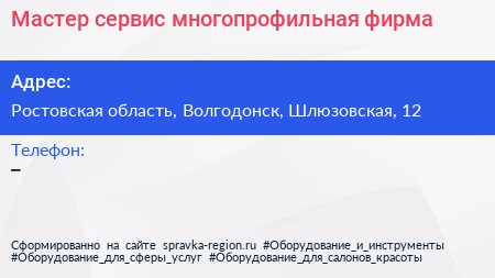Мастер-сервис, многопрофильная фирма по адресу Ростовская область, Волгодонск, Шлюзовская, 12 в дальнейшем Организация, размещена в следующих категориях: