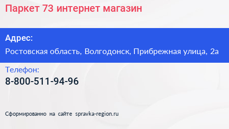 Паркет 73, интернет-магазин по адресу Ростовская область, Волгодонск, Прибрежная улица, 2а в дальнейшем Организация, размещена в следующих категориях: