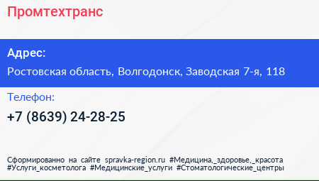 Промтехтранс по адресу Ростовская область, Волгодонск, Заводская 7-я, 118 в дальнейшем Организация, размещена в следующих категориях: