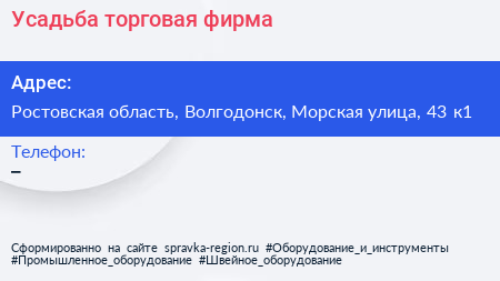 Усадьба, торговая фирма по адресу Ростовская область, Волгодонск, Морская улица, 43 к1 в дальнейшем Организация, размещена в следующих категориях: