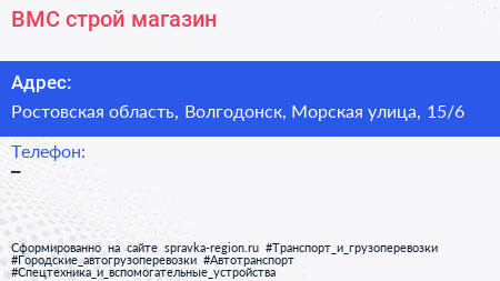 ВМС строй, магазин по адресу Ростовская область, Волгодонск, Морская улица, 15/6 в дальнейшем Организация, размещена в следующих категориях: