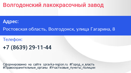 Волгодонский лакокрасочный завод по адресу Ростовская область, Волгодонск, улица Гагарина, 8 в дальнейшем Организация, размещена в следующих категориях: