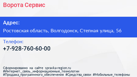 Ворота Сервис по адресу Ростовская область, Волгодонск, Степная улица, 56 в дальнейшем Организация, размещена в следующих категориях: