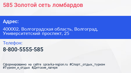 585 Золотой, сеть ломбардов по адресу 400002, Волгоградская область, Волгоград, Университетский проспект, 25 в дальнейшем Организация, размещена в следующих категориях: