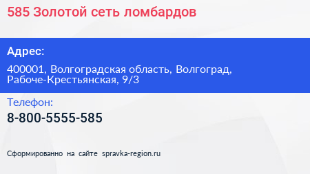 585 Золотой, сеть ломбардов по адресу 400001, Волгоградская область, Волгоград, Рабоче-Крестьянская, 9/3 в дальнейшем Организация, размещена в следующих категориях: