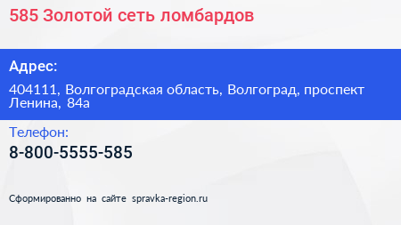 585 Золотой, сеть ломбардов по адресу 404111, Волгоградская область, Волгоград, проспект Ленина, 84а в дальнейшем Организация, размещена в следующих категориях: