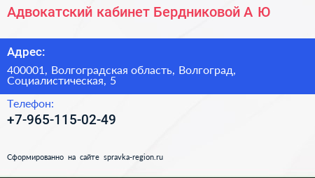 Адвокатский кабинет Бердниковой А.Ю. по адресу 400001, Волгоградская область, Волгоград, Социалистическая, 5 в дальнейшем Организация, размещена в следующих категориях: