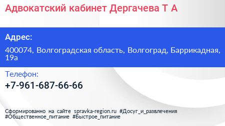 Адвокатский кабинет Дергачева Т.А. по адресу 400074, Волгоградская область, Волгоград, Баррикадная, 19а в дальнейшем Организация, размещена в следующих категориях: