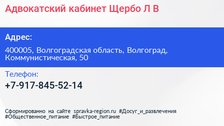 Адвокатский кабинет Щербо Л.В. по адресу 400005, Волгоградская область, Волгоград, Коммунистическая, 50 в дальнейшем Организация, размещена в следующих категориях: