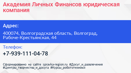 Академия Личных Финансов, юридическая компания по адресу 400074, Волгоградская область, Волгоград, Рабоче-Крестьянская, 44 в дальнейшем Организация, размещена в следующих категориях: