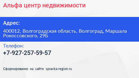 Альфа, центр недвижимости по адресу 400012, Волгоградская область, Волгоград, Маршала Рокоссовского, 29Б в дальнейшем Организация, размещена в следующих категориях: