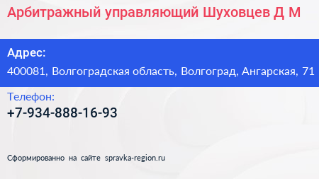 Арбитражный управляющий Шуховцев Д.М. по адресу 400081, Волгоградская область, Волгоград, Ангарская, 71 в дальнейшем Организация, размещена в следующих категориях: