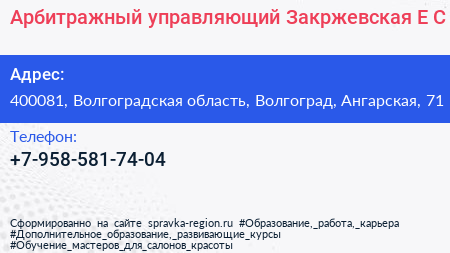 Арбитражный управляющий Закржевская Е.С. по адресу 400081, Волгоградская область, Волгоград, Ангарская, 71 в дальнейшем Организация, размещена в следующих категориях: