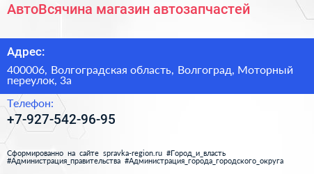 АвтоВсячина, магазин автозапчастей по адресу 400006, Волгоградская область, Волгоград, Моторный переулок, 3а в дальнейшем Организация, размещена в следующих категориях: