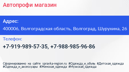 Автопрофи, магазин по адресу 400006, Волгоградская область, Волгоград, Шурухина, 26 в дальнейшем Организация, размещена в следующих категориях: