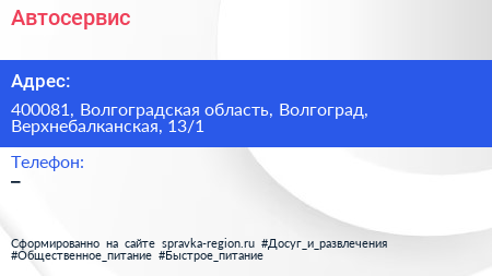 Автосервис по адресу 400081, Волгоградская область, Волгоград, Верхнебалканская, 13/1 в дальнейшем Организация, размещена в следующих категориях: