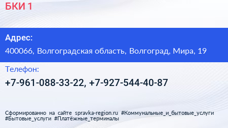 БКИ №1 по адресу 400066, Волгоградская область, Волгоград, Мира, 19 в дальнейшем Организация, размещена в следующих категориях: