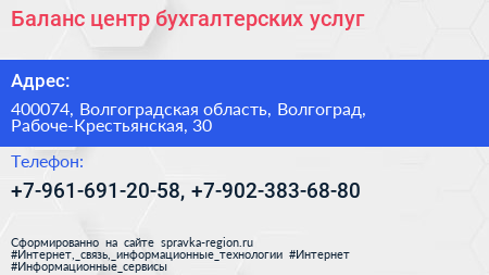 Баланс, центр бухгалтерских услуг по адресу 400074, Волгоградская область, Волгоград, Рабоче-Крестьянская, 30 в дальнейшем Организация, размещена в следующих категориях: