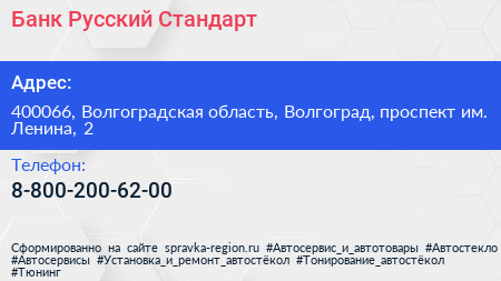 Банк Русский Стандарт по адресу 400066, Волгоградская область, Волгоград, проспект им. Ленина, 2 в дальнейшем Организация, размещена в следующих категориях: