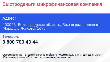 Быстроденьги, микрофинансовая компания по адресу 400048, Волгоградская область, Волгоград, проспект Маршала Жукова, 169а в дальнейшем Организация, размещена в следующих категориях: