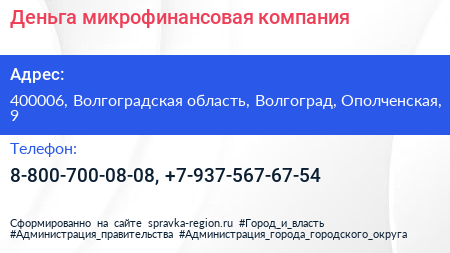 Деньга, микрофинансовая компания по адресу 400006, Волгоградская область, Волгоград, Ополченская, 9 в дальнейшем Организация, размещена в следующих категориях: