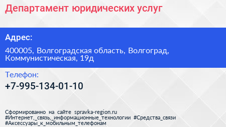 Департамент юридических услуг по адресу 400005, Волгоградская область, Волгоград, Коммунистическая, 19д в дальнейшем Организация, размещена в следующих категориях: