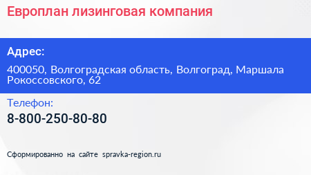 Европлан, лизинговая компания по адресу 400050, Волгоградская область, Волгоград, Маршала Рокоссовского, 62 в дальнейшем Организация, размещена в следующих категориях:
