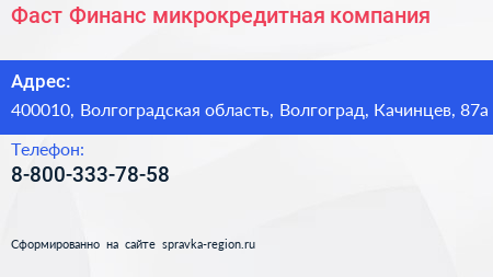 Фаст Финанс, микрокредитная компания по адресу 400010, Волгоградская область, Волгоград, Качинцев, 87а в дальнейшем Организация, размещена в следующих категориях: