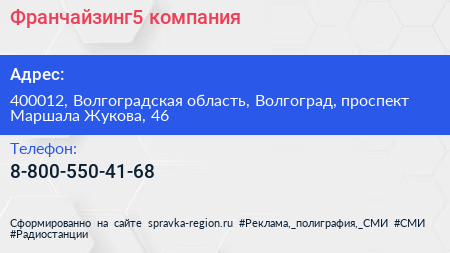 Франчайзинг5, компания по адресу 400012, Волгоградская область, Волгоград, проспект Маршала Жукова, 46 в дальнейшем Организация, размещена в следующих категориях: