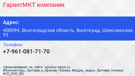 ГарантМКТ, компания по адресу 400094, Волгоградская область, Волгоград, Шекснинская, 91 в дальнейшем Организация, размещена в следующих категориях: