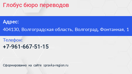 Глобус, бюро переводов по адресу 404130, Волгоградская область, Волгоград, Фонтанная, 1 в дальнейшем Организация, размещена в следующих категориях: